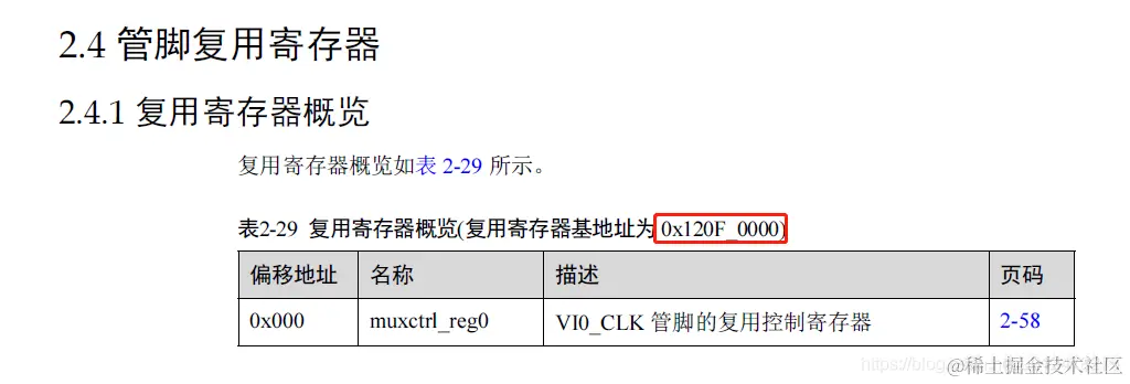 举个例子,如果我们想设置GPIO5_5,需要首先找到对应的管脚复用寄存器地址;通过手册查询,如果你想让这个管脚作为io口使用,需要给复用控制寄存器muxctrl_reg54这个寄存器里写0x01;管脚复用寄存器的基地址为0x120f_0000,muxctrl_reg54的偏移地址0xD8,所以这个寄存器的地址为0x120f00D8;