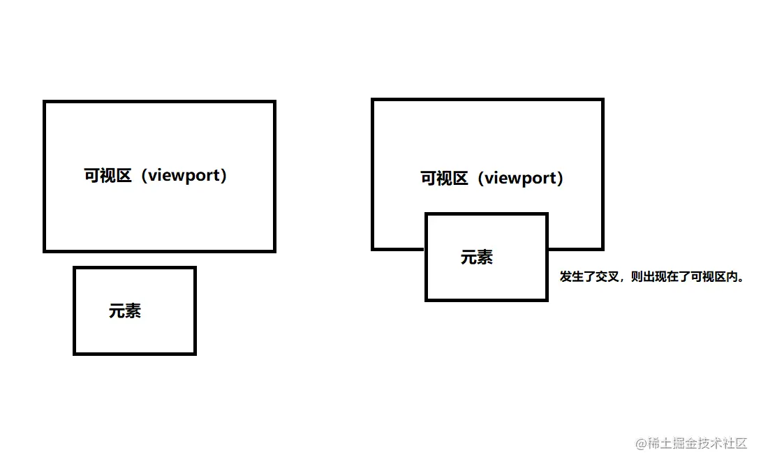 上面的图就很形象的描述了一个元素逐步出现在可视区内的过程,当元素和可视区发生交叉时,则代表进入可视区内了。而我们的 “交叉观察器” IntersectionObserve 就和名字一样,专门用来观察何时交叉。
