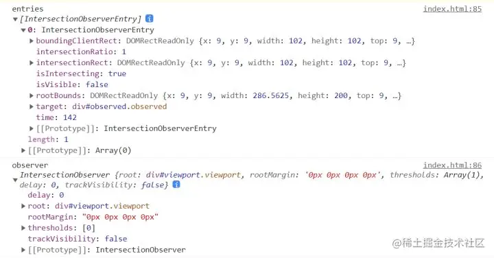 这里的代码还比较简单,我们这里设置了视图窗口为我们指定的 id 为 viewport 的元素,被观察元素为 id 为 observed 的元素。当我们刷新页面的时候,IOCallback 回调函数便会执行,且打印了 entries 和 observe,至于它们中每个参数代表的意义大家可以参照上一节。