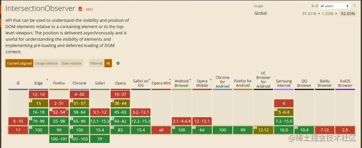 IntersectionObserve 在前几年似乎没有被重视,因为它存在兼容性问题,但是随着浏览器的更新升级,我们可以放心的使用它了。