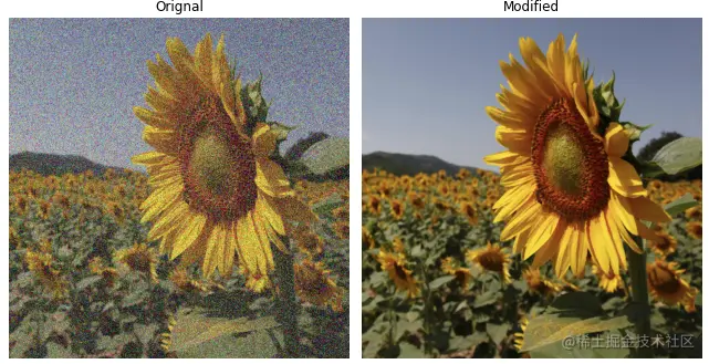 cv2.medianBlur()计算内核窗口下所有像素的中值,并用中值替换中心值。这个过滤器被高度用于去除图像中的噪音。为了演示这个滤波器的操作,我们通过使用skimage库在图像中引入了噪声;随后,中值滤波器被应用于噪声图像。