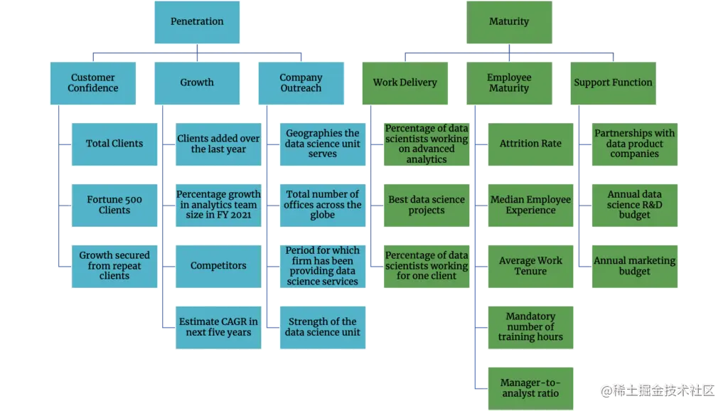 调查中的问题是通过初步研究来确定哪些方面最能定义数据科学供应商的渗透率和成熟度。根据供应商的回答,使用统一的评估标准对调查表中的每个问题进行打分,对异常值进行封顶。然后将这些分数在0到1之间进行标准化处理。最后,这些归一化分数的平均值构成了子指数,而子指数的平均值构成了各供应商的渗透率和成熟度指数。