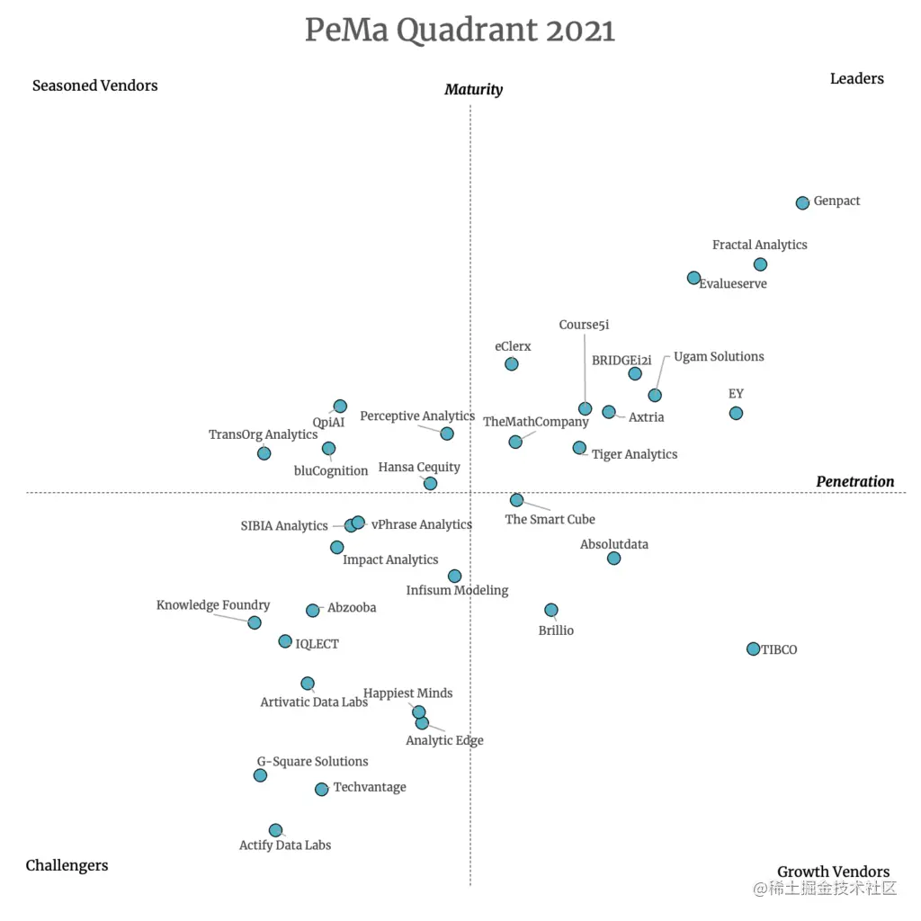 PeMa象限是根据公司的渗透率和成熟度得分绘制的--因此公司被置于四个象限中的一个--领导者、经验丰富的供应商、挑战者和成长型供应商,分别。
