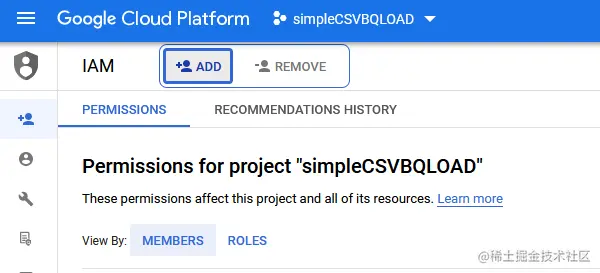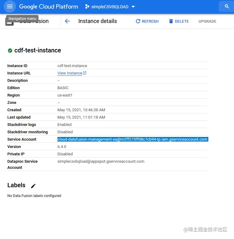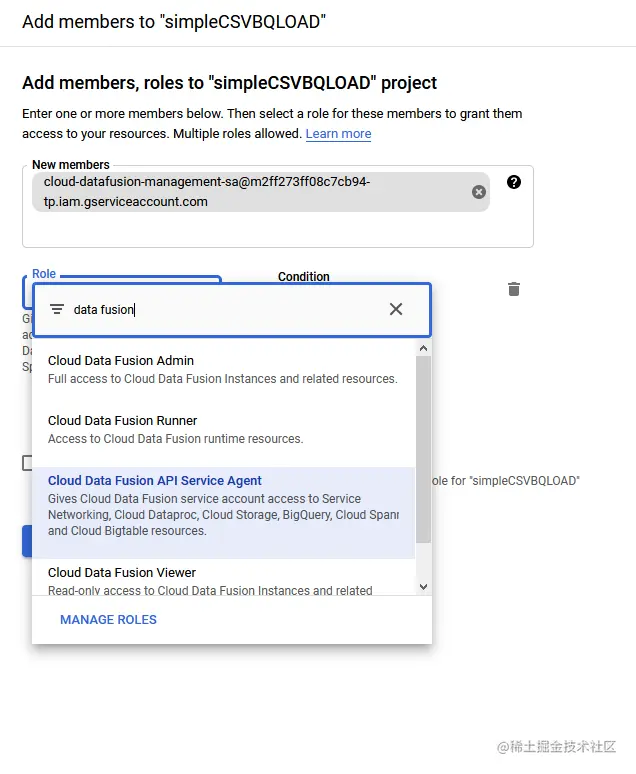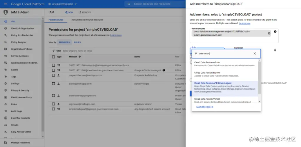 一旦数据融合实例被创建,复制数据融合正在使用的服务账户,并通过导航到IAM并点击+ADD按钮授予其**"云数据融合API服务代理 "**角色,在这个角色分配给数据融合服务账户后,数据融合可以从/到其他服务,如云存储、BigQuery和Dataproc访问数据。