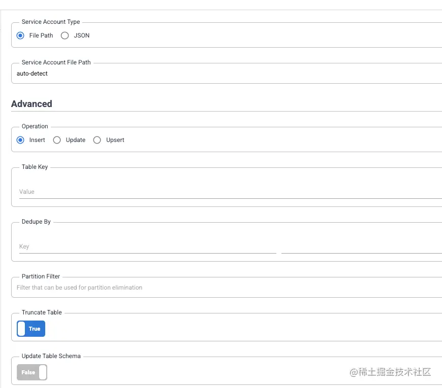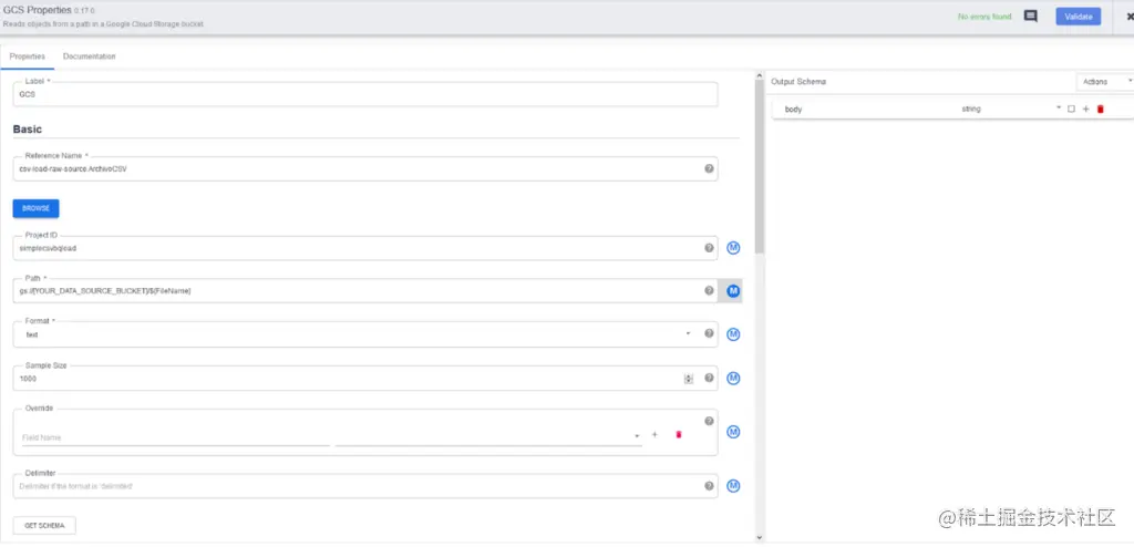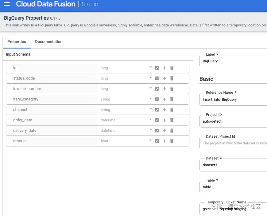 我们将把数据 集和表 设置为我们在步骤2期间在BigQuery中创建的数据集和表。我们将设置临时桶名称为gs://[YOUR_CDAP_TEMP_BUCKET]。