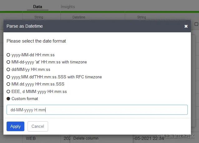 如前所述,我们必须使用自定义格式,因为输入日期的格式是dd-MM-yyy H:mm ,所以选择 "自定义格式 "选项,在文本字段中提供格式,然后点击应用。