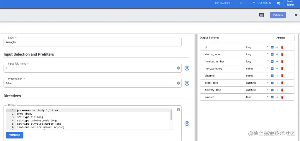 最后,点击右上方的Apply按钮,你将回到wrangler属性页面,现在你将看到JEXL语法中的配方,你还将看到右边的输出字段,这些字段将从管道中的wrangler步骤中产生。