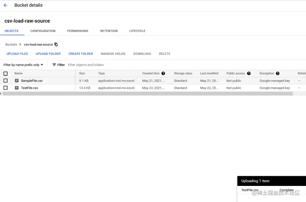 上传到GCP的原始CSV源文件的桶(上传到这个桶的文件将触发数据转换和数据加载过程,这个桶将在编写云功能时作为该功能的触发事件使用)。