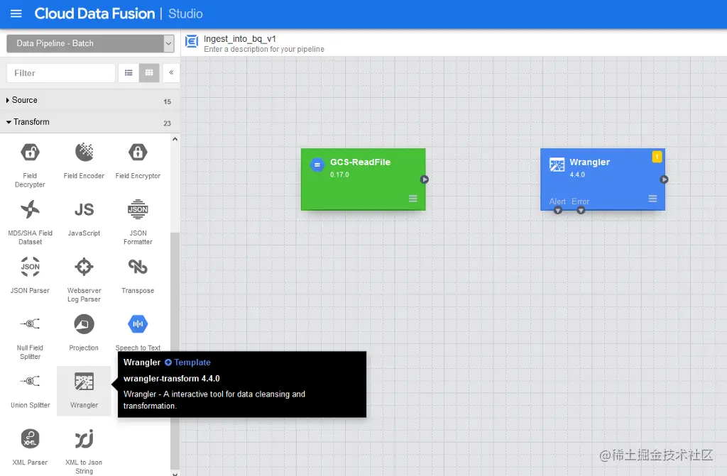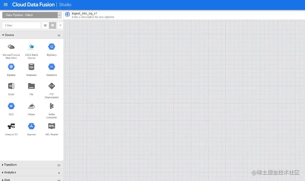 现在,实例已经创建,并且我们确保数据融合使用的服务账户具有所需的权限,我们准备创建数据转换管道,它将接受CSV源文件,对其进行一些转换,并将数据加载到我们先前创建的BigQuery中的表。