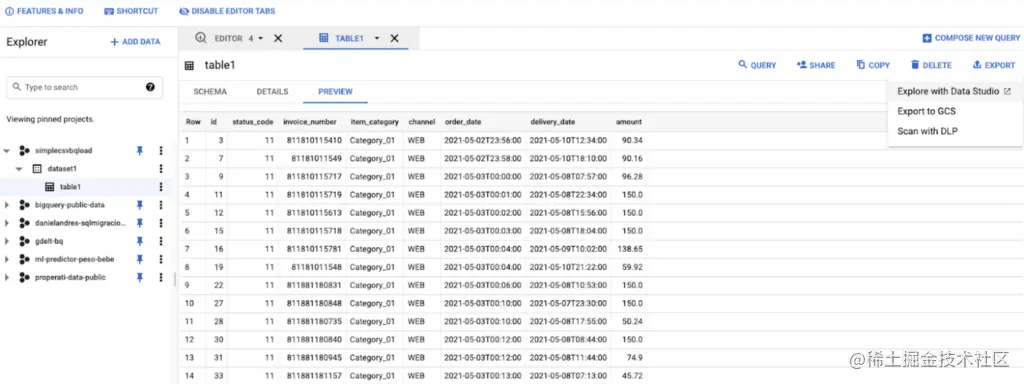现在我们有一些BigQuery中的数据可供利用,我们将在Data Studio中快速创建一个简单的报告。在同一个BigQuery表浏览器中,用右边的导出菜单导出表,开始在Data Studio中探索数据。