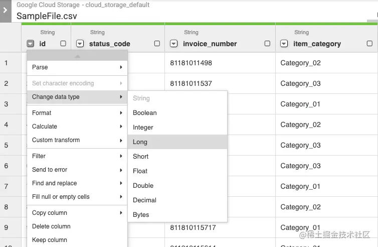 首先,通过这个相同的程序,我们将改变字段id、status_code 和 invoice_number的数据类型为Long,所以它们可以插入BigQuery表中。