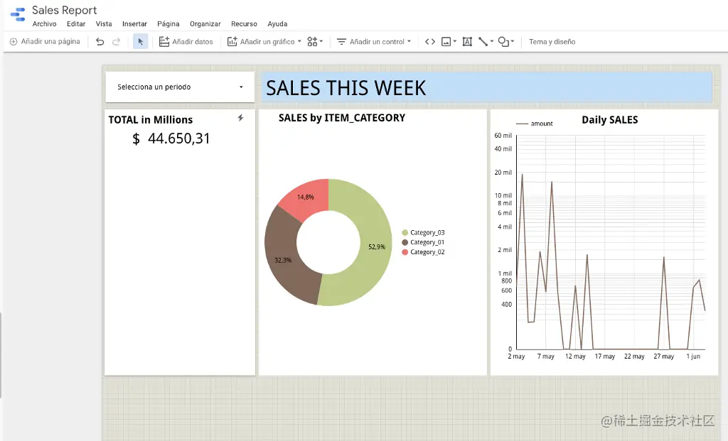 我们刚刚添加了3个非常简单的可视化数据,一个是列金额的总和,一个是按项目_类别划分的记录百分比分布的环形图,一个是按订单_日期划分的金额的时间序列图**,现在由于输入的数据在订单_日期**列中只有2天的数据,图表看起来很奇怪,我们将添加一个有更多记录的新文件来看看区别。