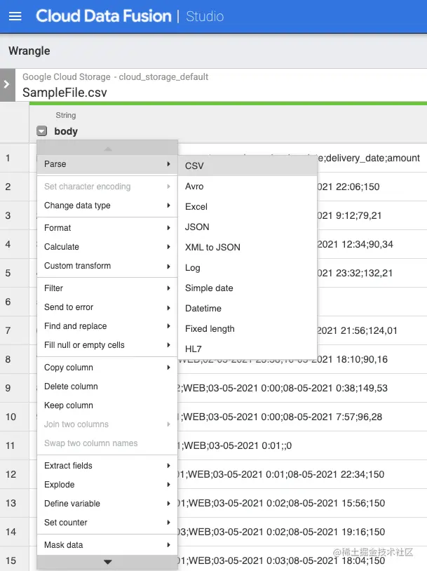 首先,我们将让Wrangler把文件解析为一个以分号分隔的CSV文件。点击列名**(body)**左边向下的小箭头,并选择parse→CSV选项。