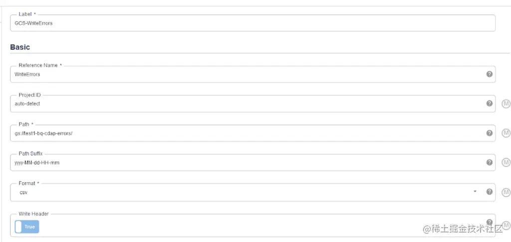从ErrorCollector拖动一个箭头到GCS Writer,然后将鼠标悬停在新添加的GCS Writer上,访问其属性。在这里,我们将设置标签 为 "GCS-WriteErrors",路径 字段为步骤1中创建的gs://[YOUR_CDAP_ERRORS_BUCKET],格式 为CSV,写头标志为True,最后我们将设置输出文件前缀为 "errors"。这将写一个CSV文件到你定义的路径上,并在管道执行过程中,按每一个从wrangler出来的错误添加一个新行。