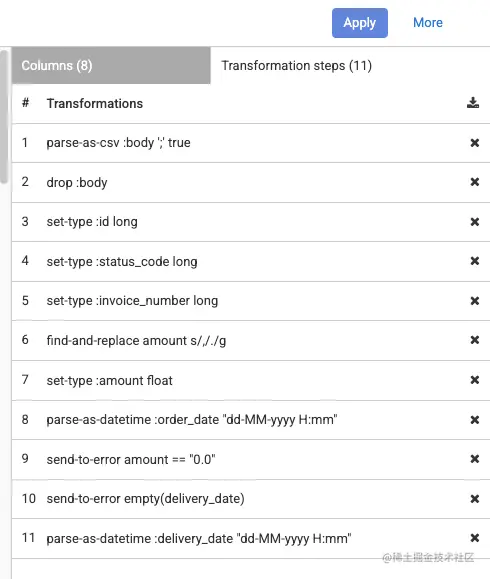 文件内容将显示在左边,而将走出wrangler的列则显示在右边的部分。就目前而言,wrangler将文件中的每一行作为一个名为 "body "的字段来读取,并按原样输出。我们现在开始进行转换。