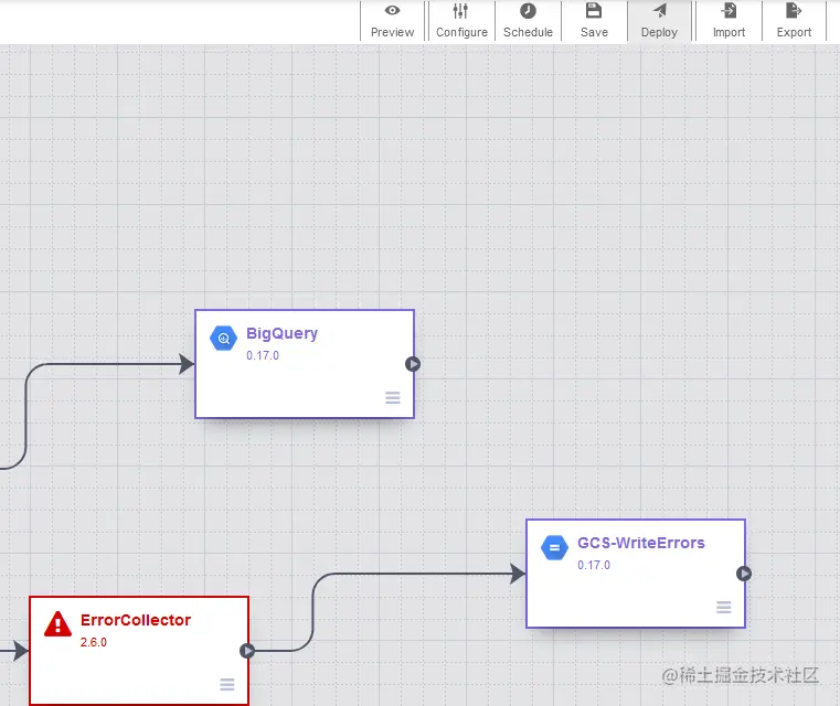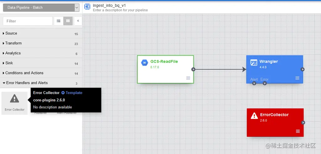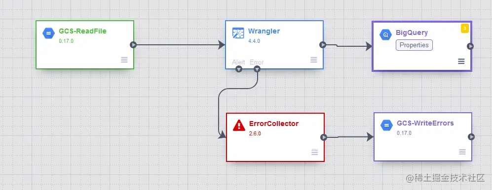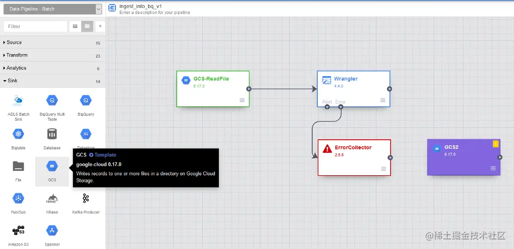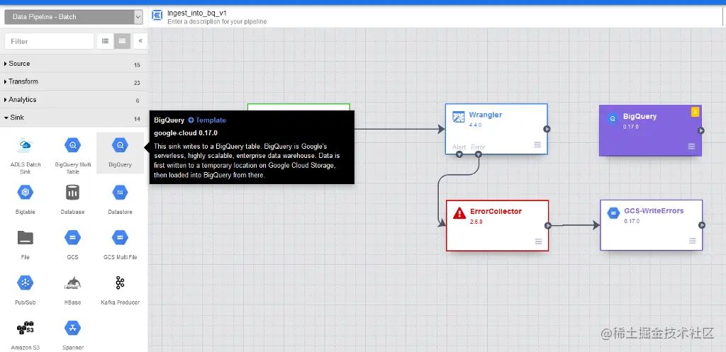 现在我们已经正确处理了错误,我们将添加管道的最后一步,将wrangler的输出摄入BigQuery表。在左边菜单的同一水槽部分,点击BigQuery图标,并从wrangler的输出拖动一个箭头到这个新图标。