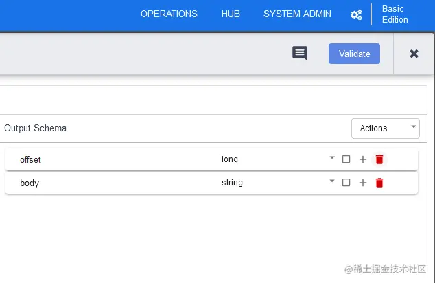 在右边的输出模式部分,删除偏移量 字段,这样它就不会被传递到管道的下一步,只有文本的主体被传递到我们将在管道的下一步设置的数据rangler组件中。