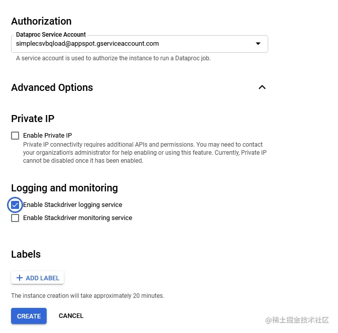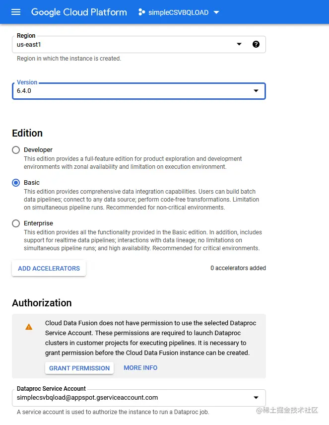 Data Fusion利用Cloud Dataproc作为其底层大数据处理引擎,这意味着当数据管道被执行时,Data Fusion会产生一个短暂的Dataproc集群来为你执行数据处理,并将管道处理作为一个火花作业提交给Dataproc集群,一旦作业执行完毕,Data Fusion就会为你删除Dataproc集群。确保授予Data Fusion使用的服务账户适当的权限,以催生云Dataproc集群,它会提示你授权,当它这样做时,点击GRANT PERMISSION按钮**(还要记住部署Data Fusion实例的区域,需要与创建BigQuery数据集的区域相匹配)**。