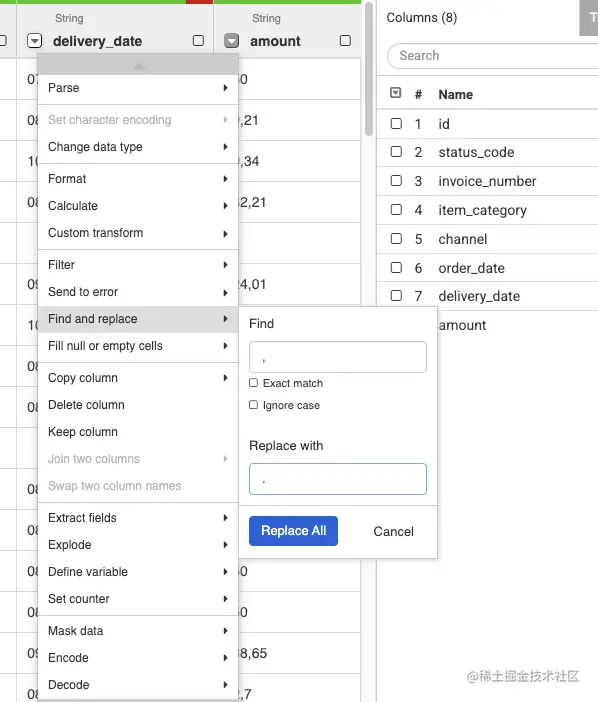 接下来,在将数据类型改为浮动之前,我们将把金额字段中的逗号替换为点,这样它就可以很容易地作为一个浮动值插入BigQuery中,这样逗号就不会被误解为千位数分隔符(这是由非英语国家使用点作为千位数分隔符而不是逗号以及逗号被用作小数分隔符造成的)。我们将使用查找和替换功能来处理这个问题,在旧值字段填写逗号,在新值字段填写点,然后点击全部替换按钮。