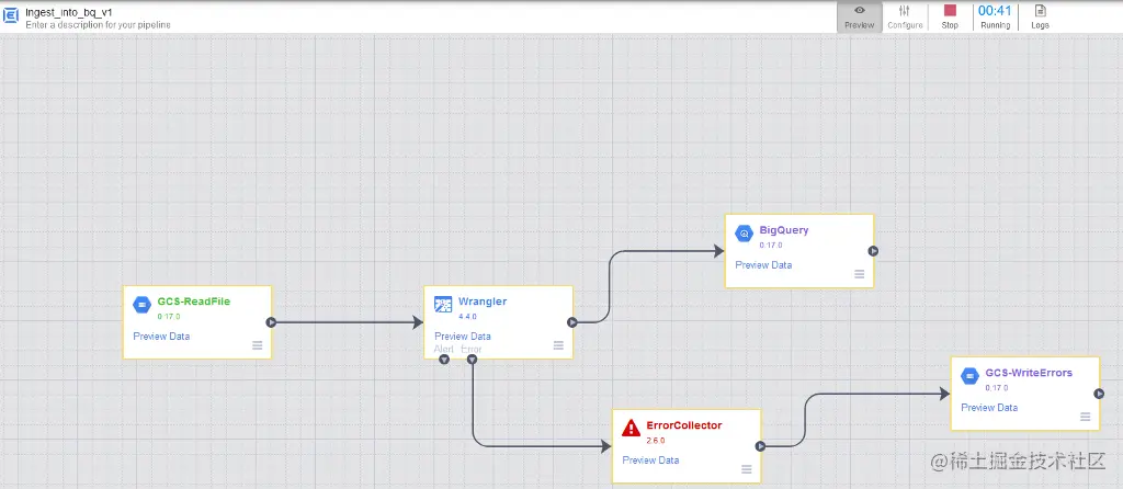 管道的预览将运行约一分钟,但不会进行实际执行,不会产生Dataproc集群,也不会有记录被写入BigQuery表。