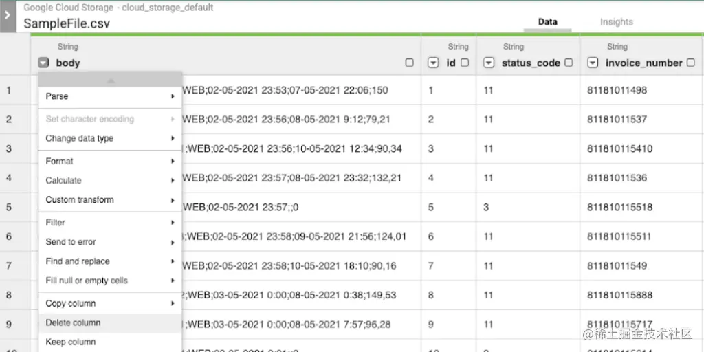 现在,Wrangler已经分离了文件中的所有输入字段,并为每个字段创建了一个列,这反映在右边的输出列列表中,它将正文输入作为一个单独的列,但我们不需要它,所以我们将像之前那样选择它并选择 "删除列 "选项来删除它。