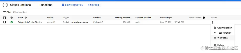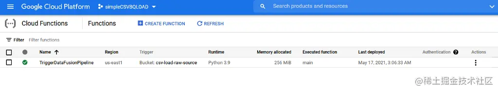现在,转换数据并将其加载到BigQuery的数据融合管道已经部署并准备好执行,我们将设置云函数,当有新文件上传到数据源GCS桶时,该函数将被触发。这个函数的目的是将新上传的文件传递给数据融合管道并开始执行。