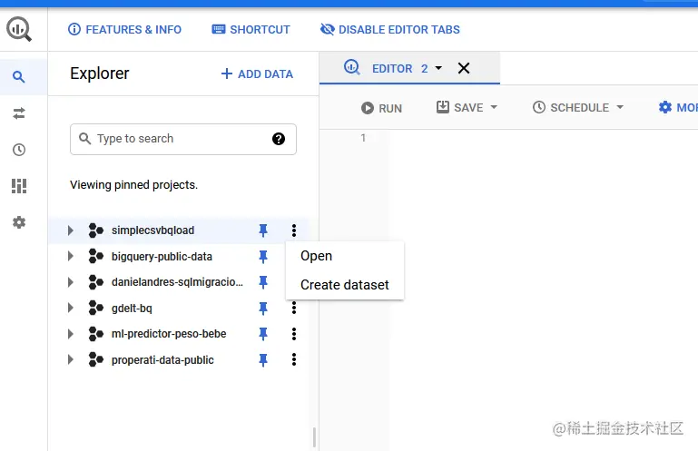 导航到BigQuery服务,在你的项目中,创建一个新的数据集,为了简单起见,我把它命名为dataset1。