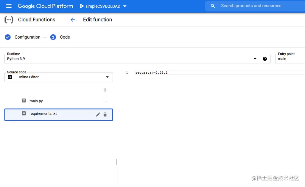 在云功能向导的代码部分,在左边你会看到一个文件模板的列表,这些模板是自动为你创建的,根据你将使用的运行时间和语言来创建你的功能,这些模板是必须的。由于我们将使用Python 3.9运行时来创建函数,因此将创建2个文件:main.py和requirements.txt。