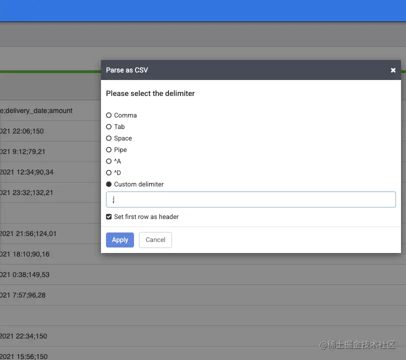 由于CSV文件中的列是用分号(;)分隔的,我们在弹出的窗口中选择自定义分界符,并在其中插入一个分号,我们还勾选了将第一行作为标题的标志,然后点击应用。