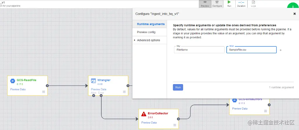 现在管道已经完成,你可以通过点击画布顶部的预览按钮来尝试管道的模拟运行,并手动设置我们设置的文件名作为管道定义的运行时参数(在管道部署并从云功能执行后,该运行时参数将被填充为上传到gs的 实际文件名**。//[YOUR_DATA_SOURCE_BUCKET]** ,它将在运行时传递给管道),现在我们将提供我们在步骤1中上传到桶中的相同的文件名,以便于本次试运行,然后点击运行。