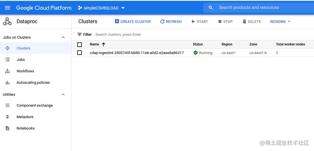 在Dataproc集群页面,你会看到Data Fusion已经产生了一个短暂的集群,只要管道在运行,它就会保持活力,当它结束时,它会被销毁。