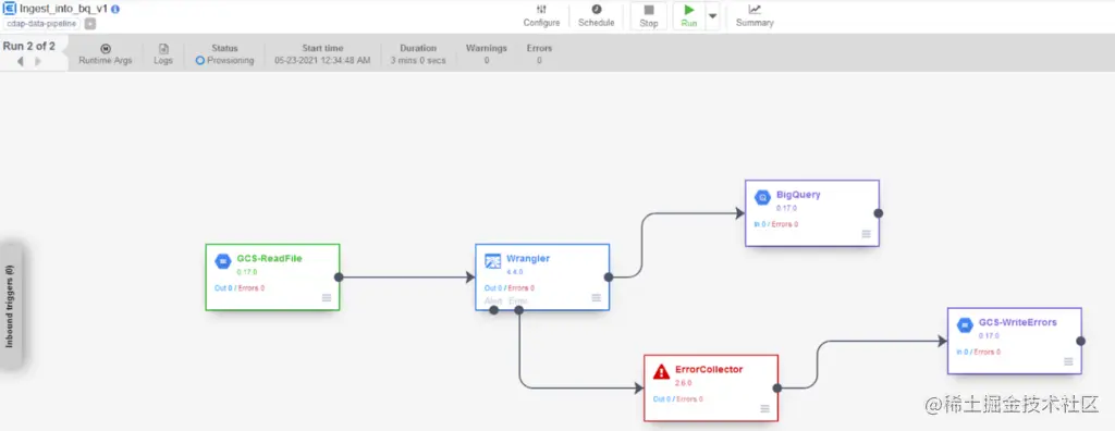 大约5到6分钟后,管道的执行将结束,状态将变为Succeeded,你将在Data Fusion中看到有多少记录从每一步传到下一步。通过点击顶部的Runtime Args,你还可以看到云功能作为FileName参数传递给管道的值。