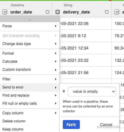 选择delivery_date 列中的Send to errorTransformation,将条件设置为 "值为空" ,然后点击Apply。