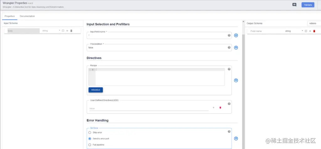 在这里,你可以给标签加上任何你喜欢的名字,现在,我们将保留所有的默认值,但我们将把错误处理行为从默认的 "跳过错误",改为 "发送到错误端口",这样我们就可以把管道执行期间的错误重定向到GCS的一个文件,以便以后进一步处理。我们可以使用JEXL语法(https://commons.apache.org/proper/commons-jexl/reference/syntax.html)直接用指令编写转换的配方,但为了简单起见,并利用数据融合用户界面的优势,我们将使用wrangler工具来做,无论我们在wrangler中做什么,以后都会被翻译成JEXL指令并显示在这里的配方下。点击指令部分下面的WRANGLE按钮。