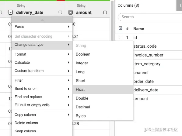 默认情况下,由于这是一个CSV文件,Data Fusion将所有的输入都视为字符串,我们需要改变这一点以正确插入数据。我们将使用列上的箭头菜单中的改变数据类型选项,将数据类型设置为与我们在步骤2中定义的BigQuery表中的列相匹配。
