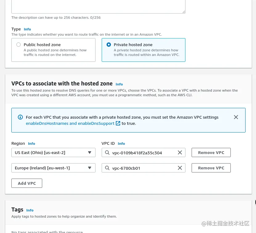 下面,你会看到新的选项,可以选择AWS区域和其中的VPC,从那里可以访问这个DNS区域。