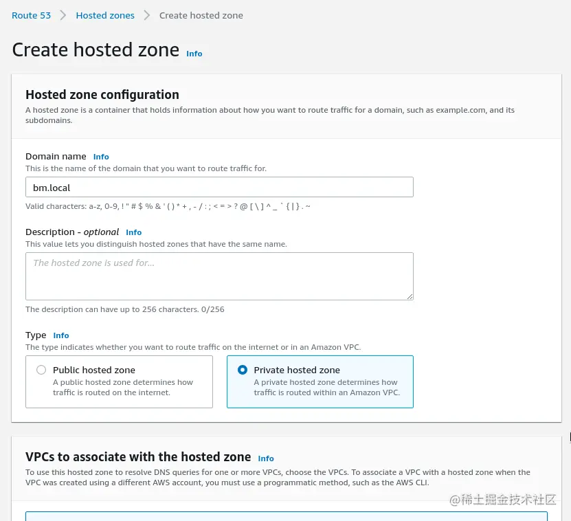 转到Route53,创建一个新的区域,将其类型设置为_私有托管区_。