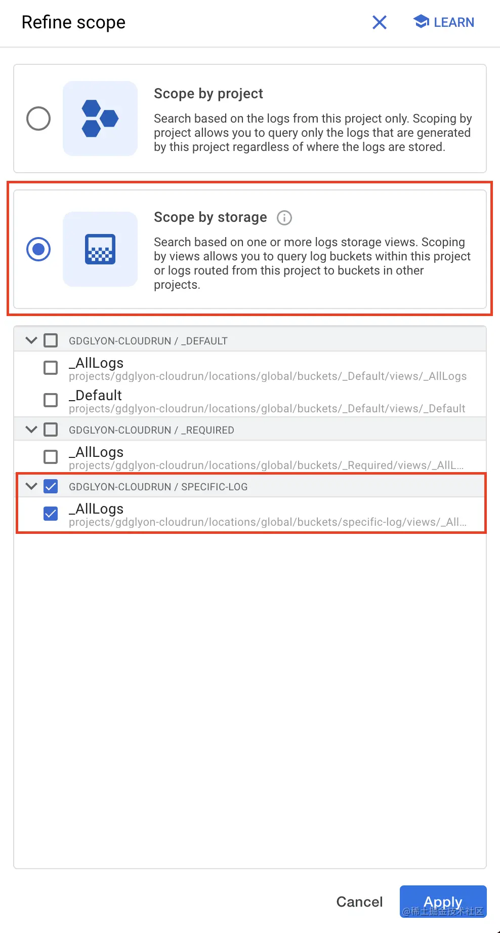 - 选择按存储范围选项,并只选择你的特定日志桶