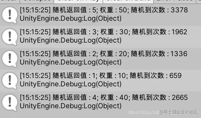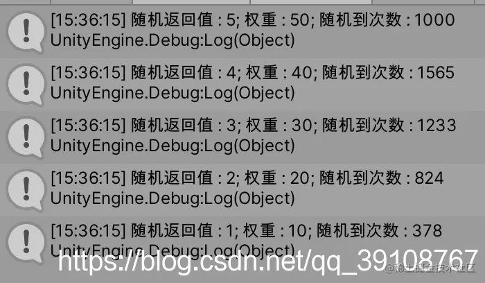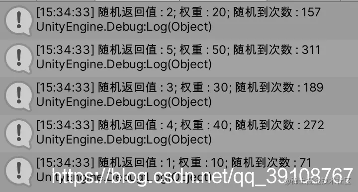 Debug.Log(string.Format("随机返回值 : {0}; 权重 : {1}; 随机到次数 : {2}",item.Key.value,item.Key.weight,item.Value));