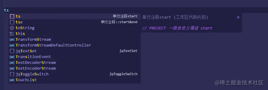 使用说明:代码片段是需要通过 关键字 才能呼唤出来的。比如 如上的普通的单行注释就是通过 ts呼唤出来的,然后按一下补全的键,进行常规补全操作即可,就像windows系统的tab键。