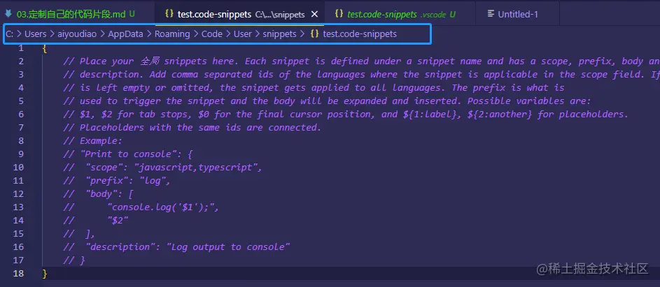 至于如何去找vscode的用户全局目录,你新建一个全局的代码片段,然后从vscode的面包屑导航中就能看到了。