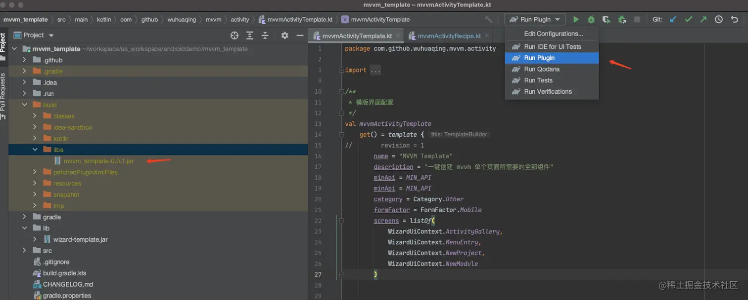 在项目中,我们总会有一些框架内的模版代码需要反复创建,耗时且低效,怎么忍受的了,这些反复搬来搬去的东西所费的时间用来摸摸鱼,不香?Android Studio 4.1及以后的各动物版本,对模版代码的支持是以插件的形式来处理 通过对插件的基础配置以及项目模版代码的配置,最终以jar的形式安装到Android Studio的本地插件中,以此来创建模版代码(案例:mvvm_template)
