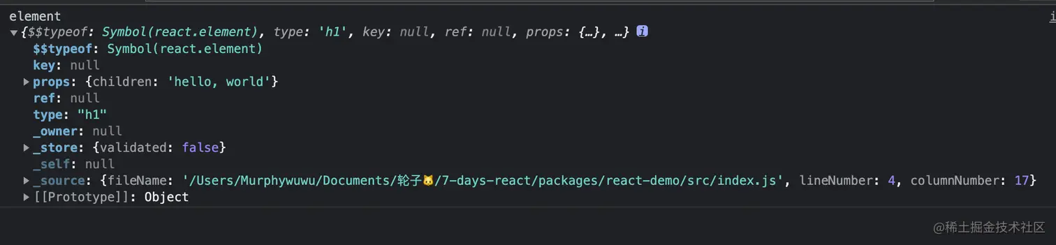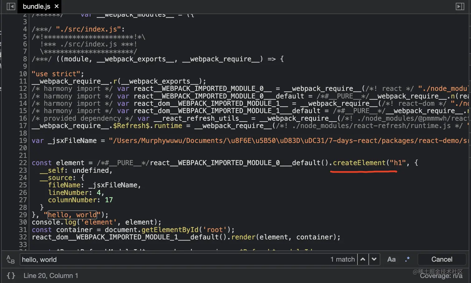 通过调试,我们可以知道这里的react_WEBPACK_IMPORTED_MODULE_0__default()其实就是React,所以,实际上<h1>hello,world</h1>这段JSX代码被转换成了React.createElement(...)的样子