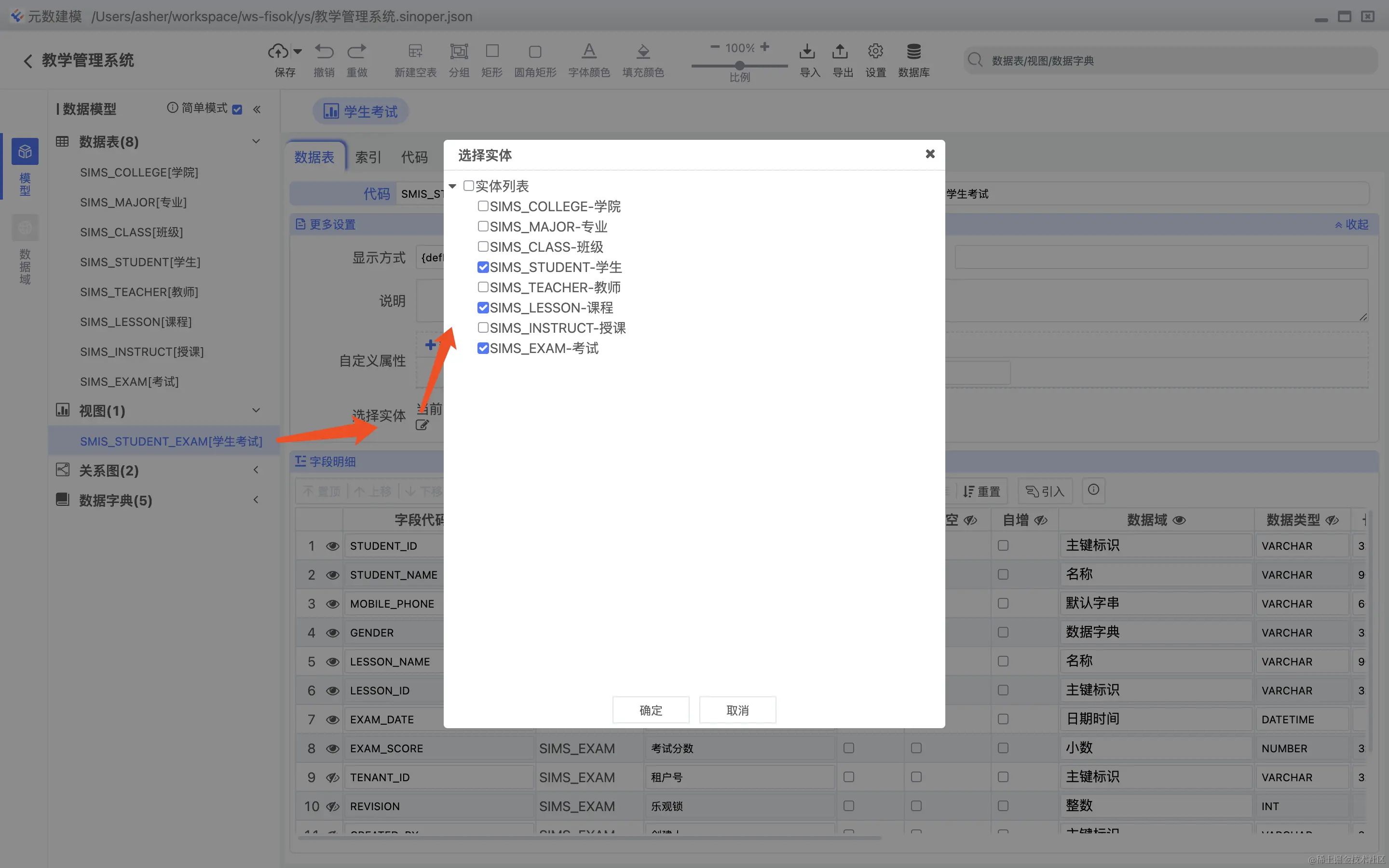视图由多个表结合而成,支持多表以及字段的选择,如下图:
