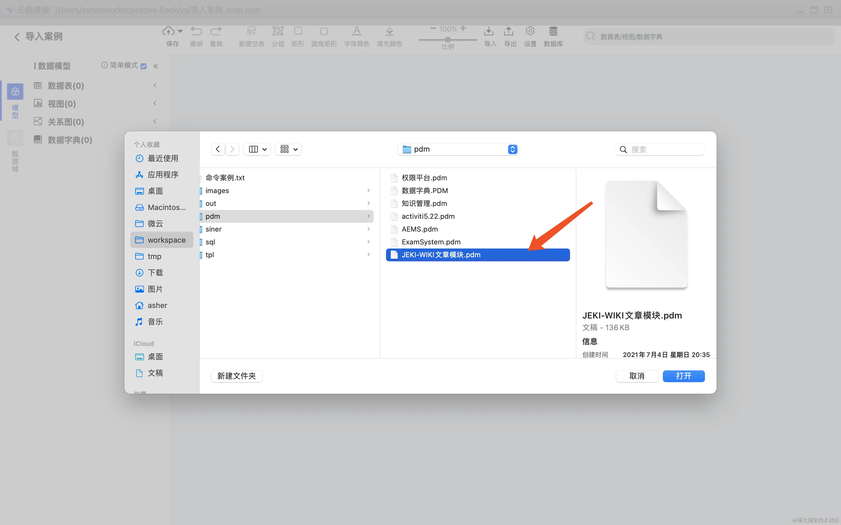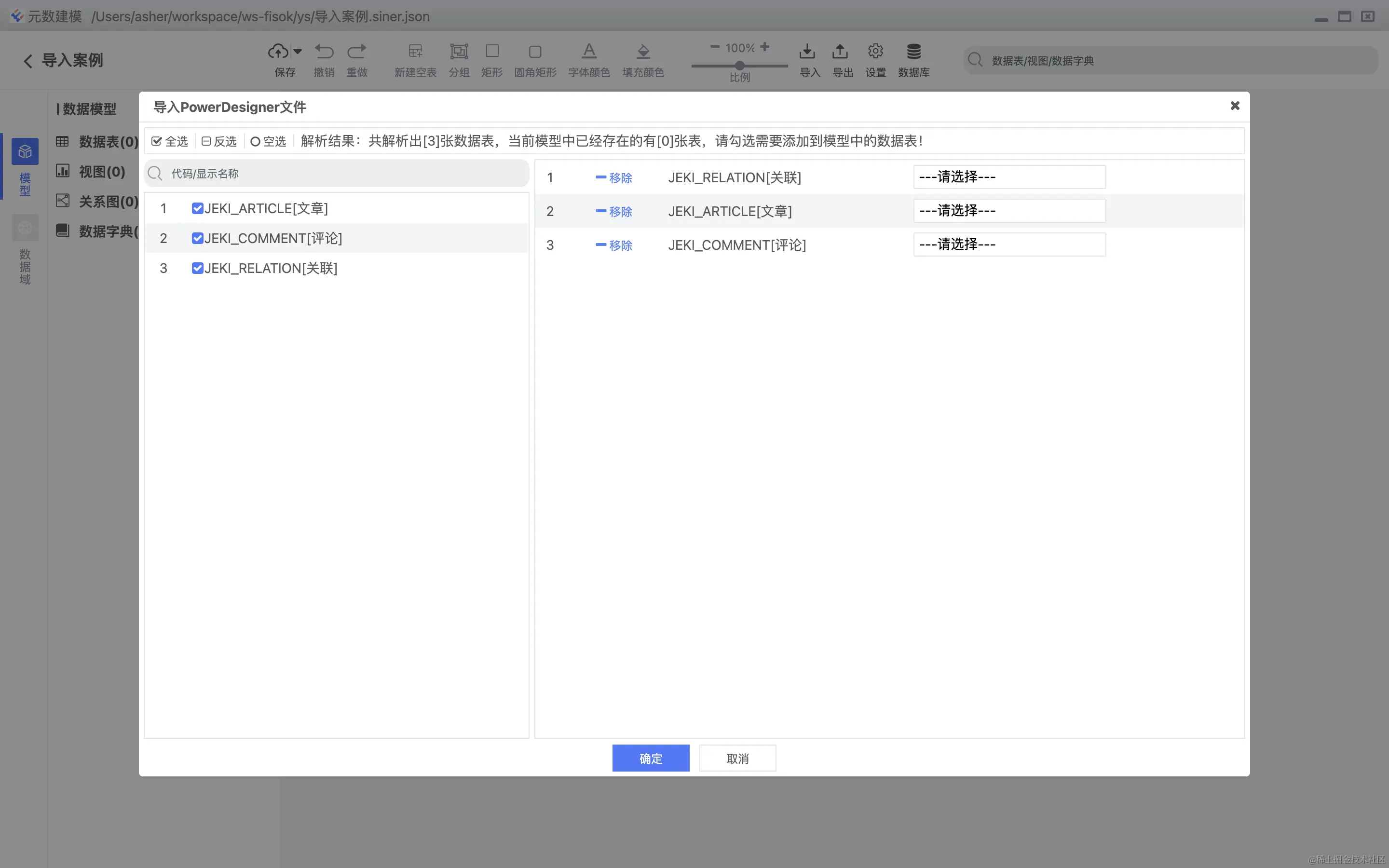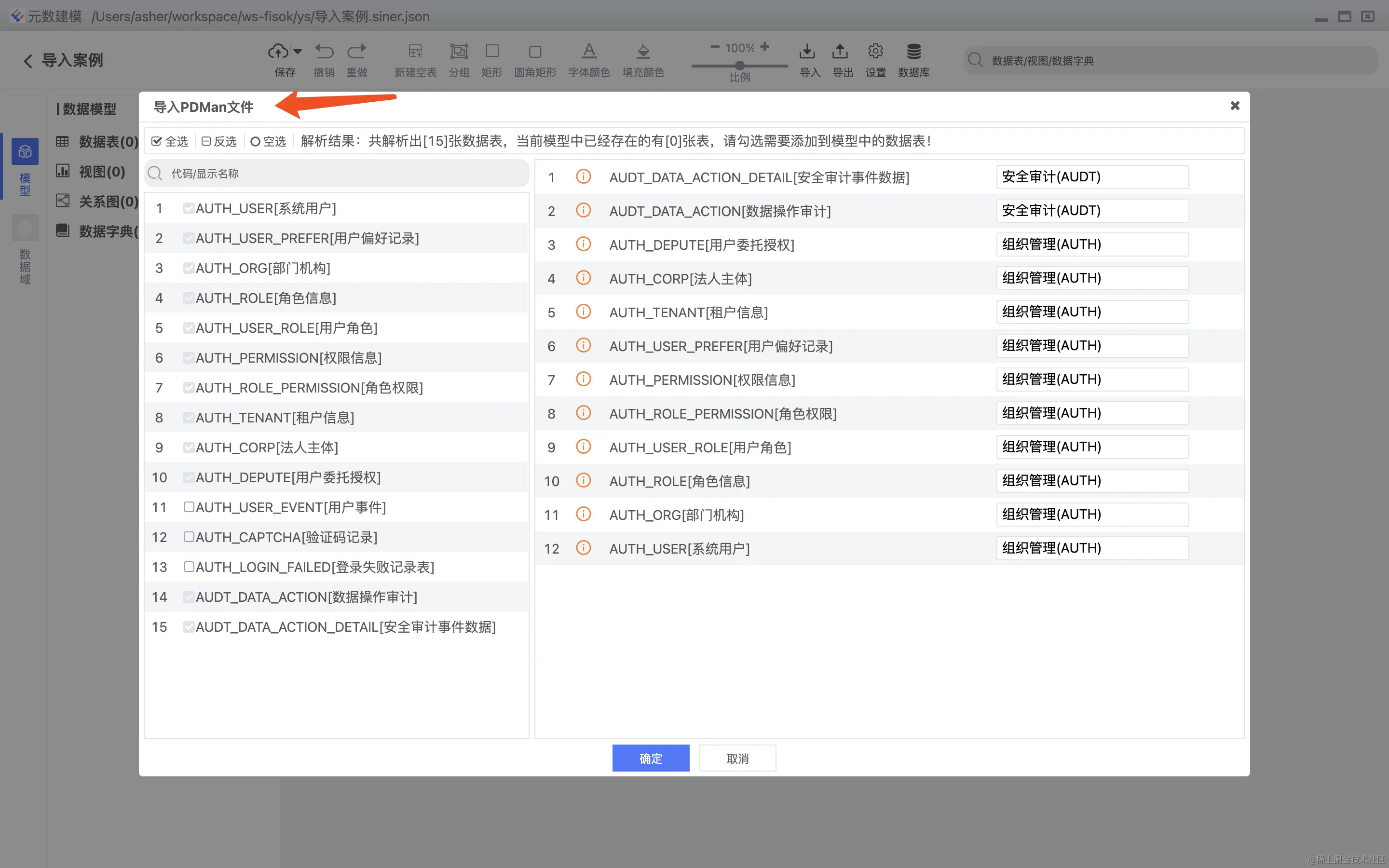 支持PDMan的导入,支持数据表,关系图,数据域的高度还原。 导入列表选择,如下图: