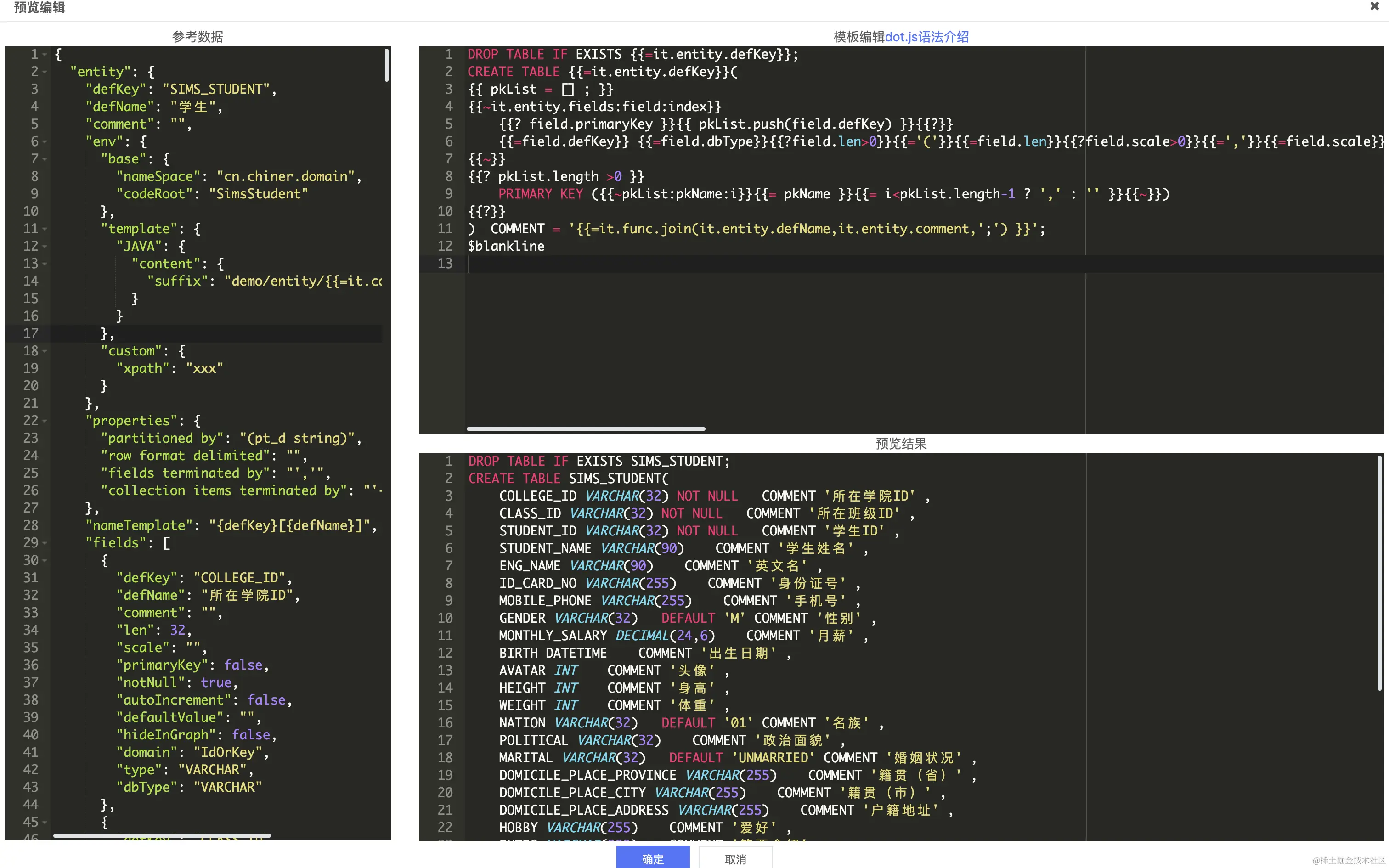 提供代码预览编辑,以便能够及时预览代码模板的效果,如下图: