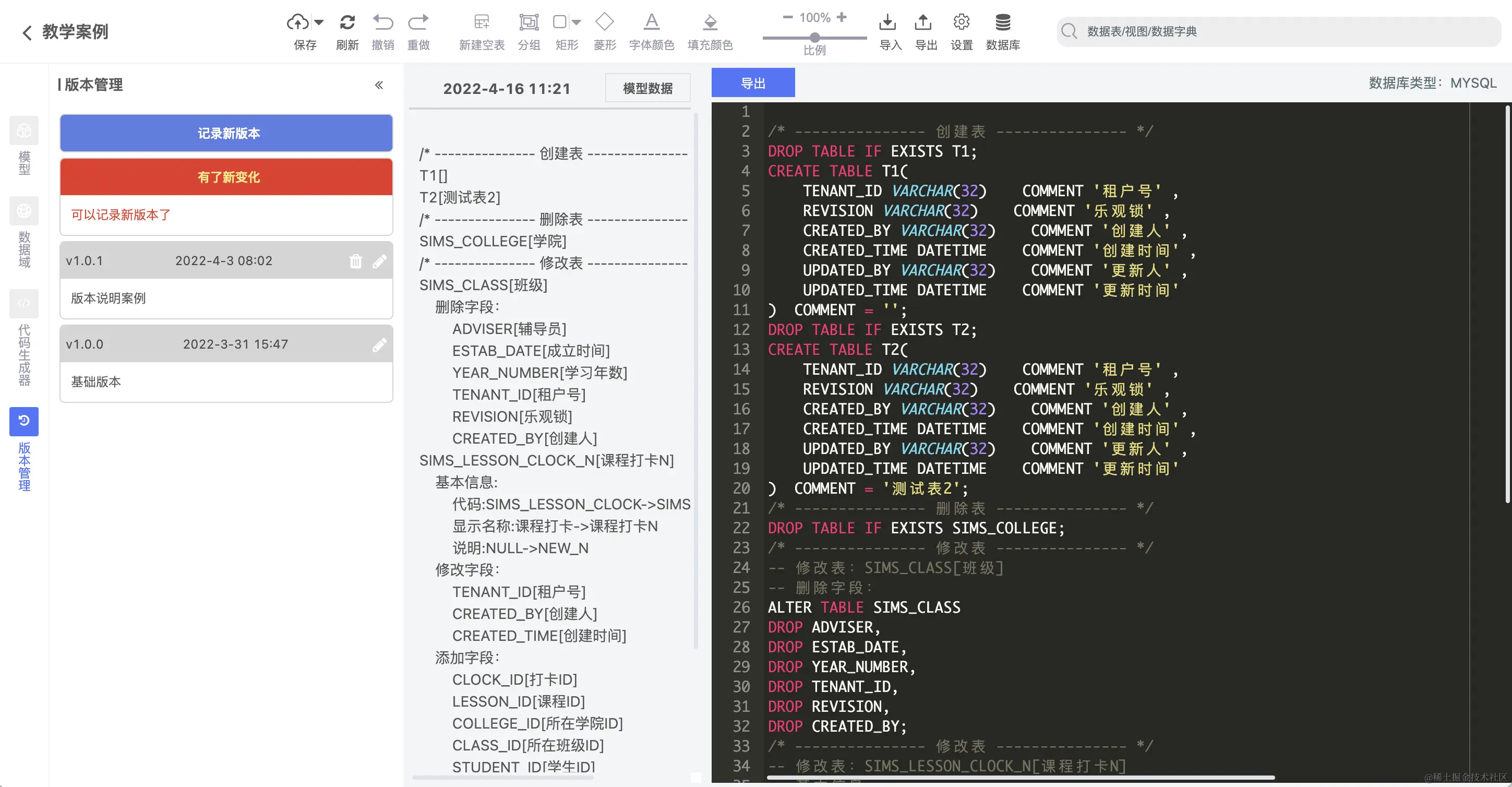 - 数据表版本管理,添加、更改、删除字段以及表信息后,会自动生成变更脚本。