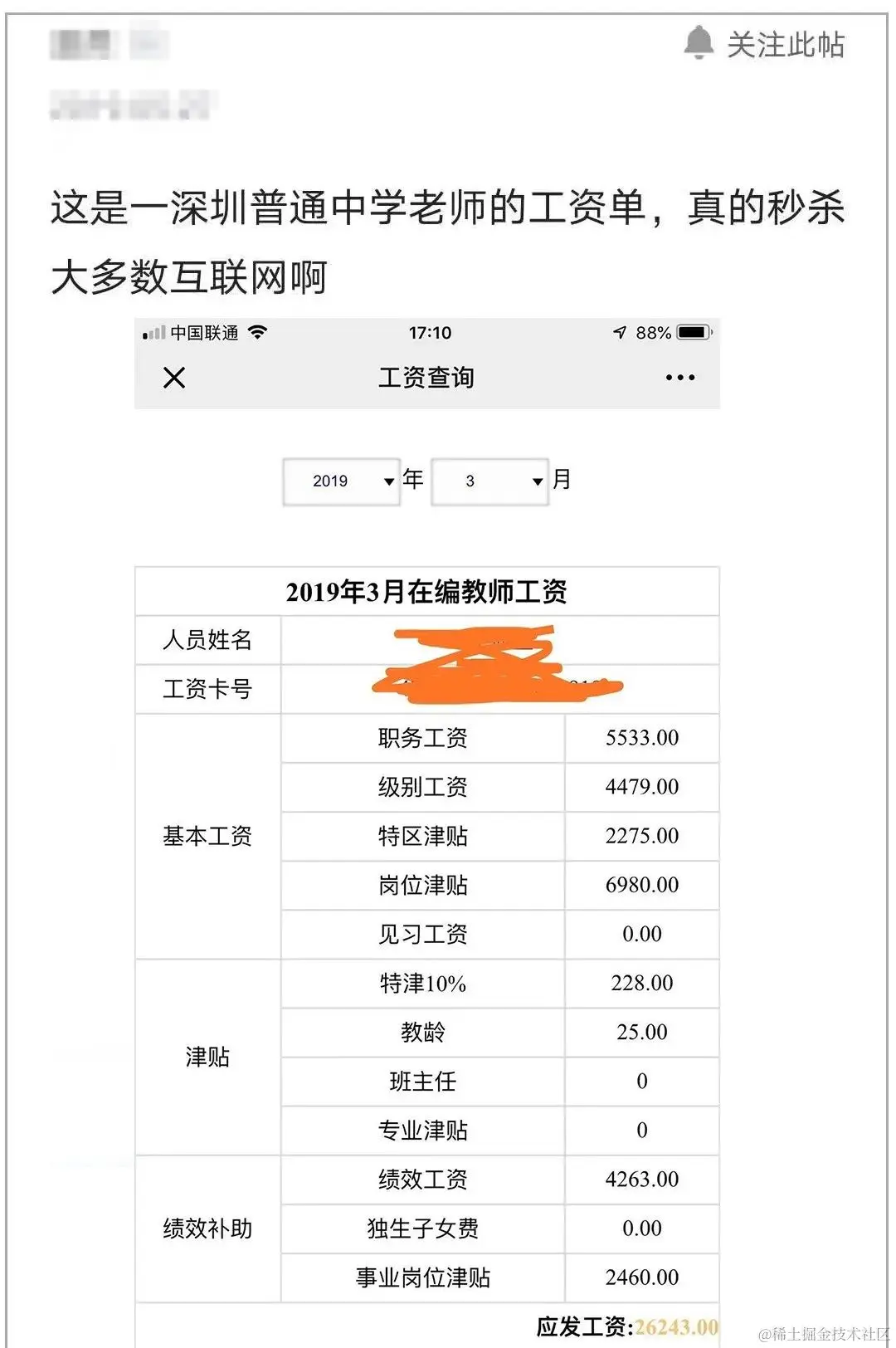近日,一张深圳普通中学老师的工资单在网络上热传,从应发工资来看,简直秒杀程序员的薪资,让网友纷纷感叹,这工资,有寒暑假还不用996,简直了!
