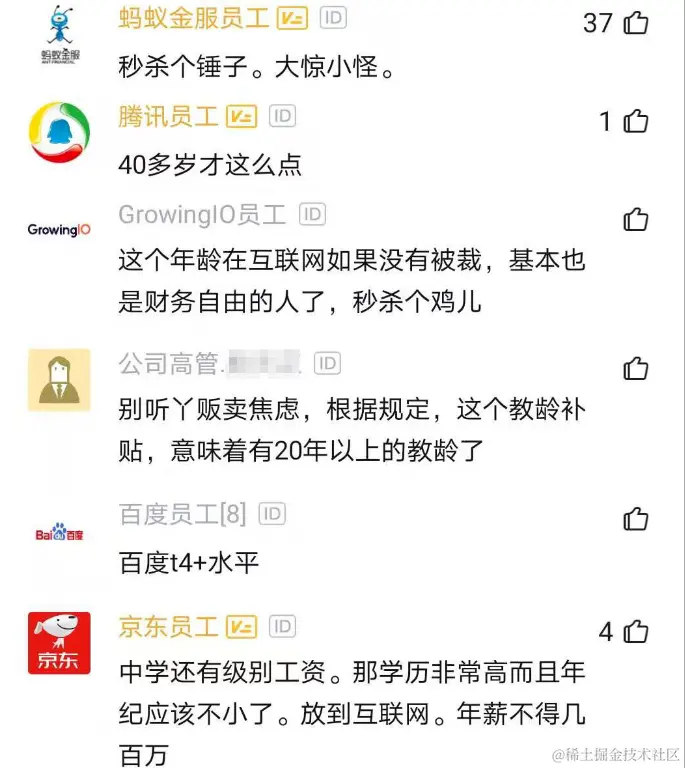 **网易考拉海购员工 :**真酸,互联网20多就能拿这工资,就算只干十几年,拿到的钱也比大部分人多了。更何况,40多的员工不要太多哦,到了40就是管理层了失什么业。