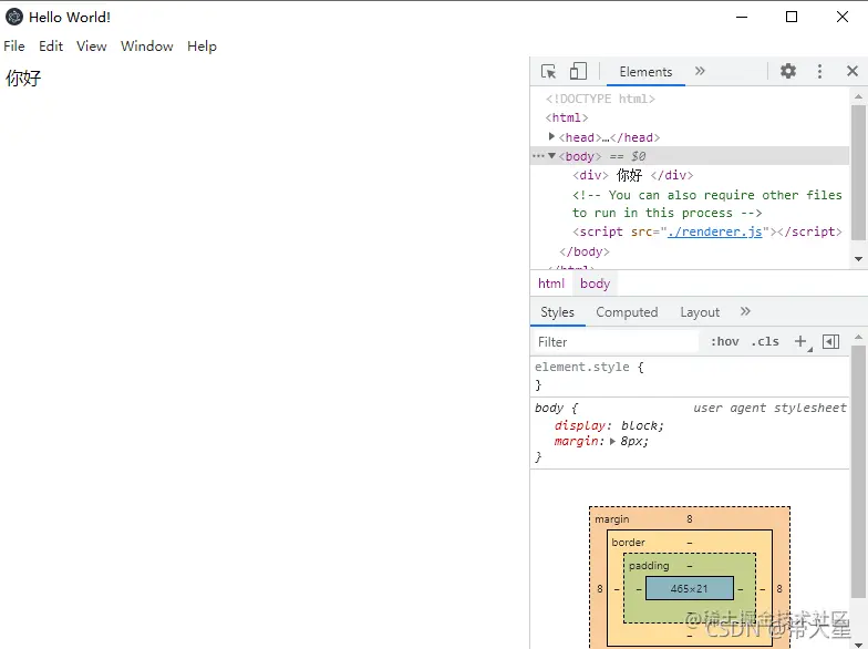 如何调试页面呢?electron的调试方法和chrome浏览器类似,点击菜单栏的View中的Toggle Developer Tools或者直接快捷键Ctrl+Shift+i会调出开发者工具界面